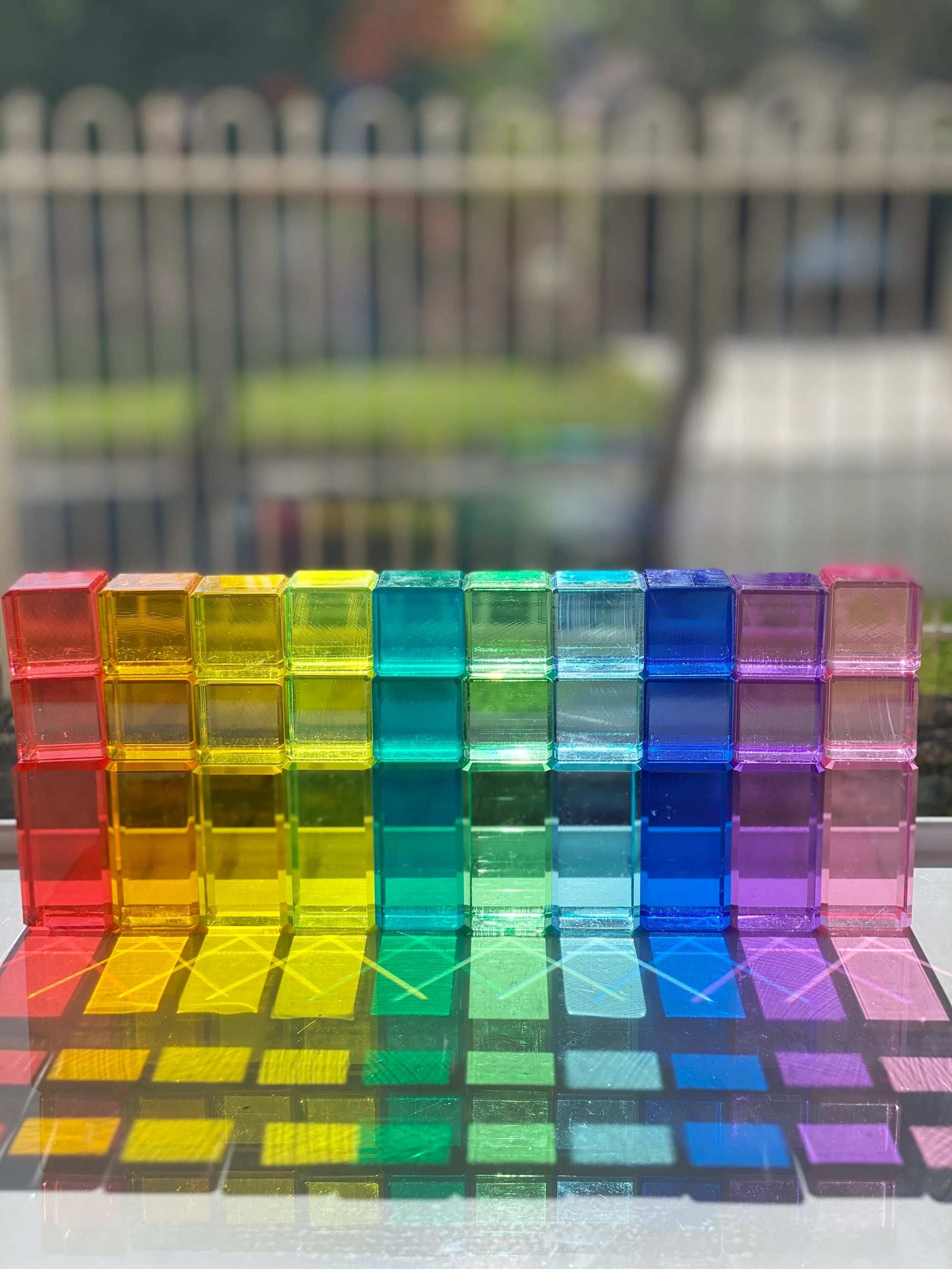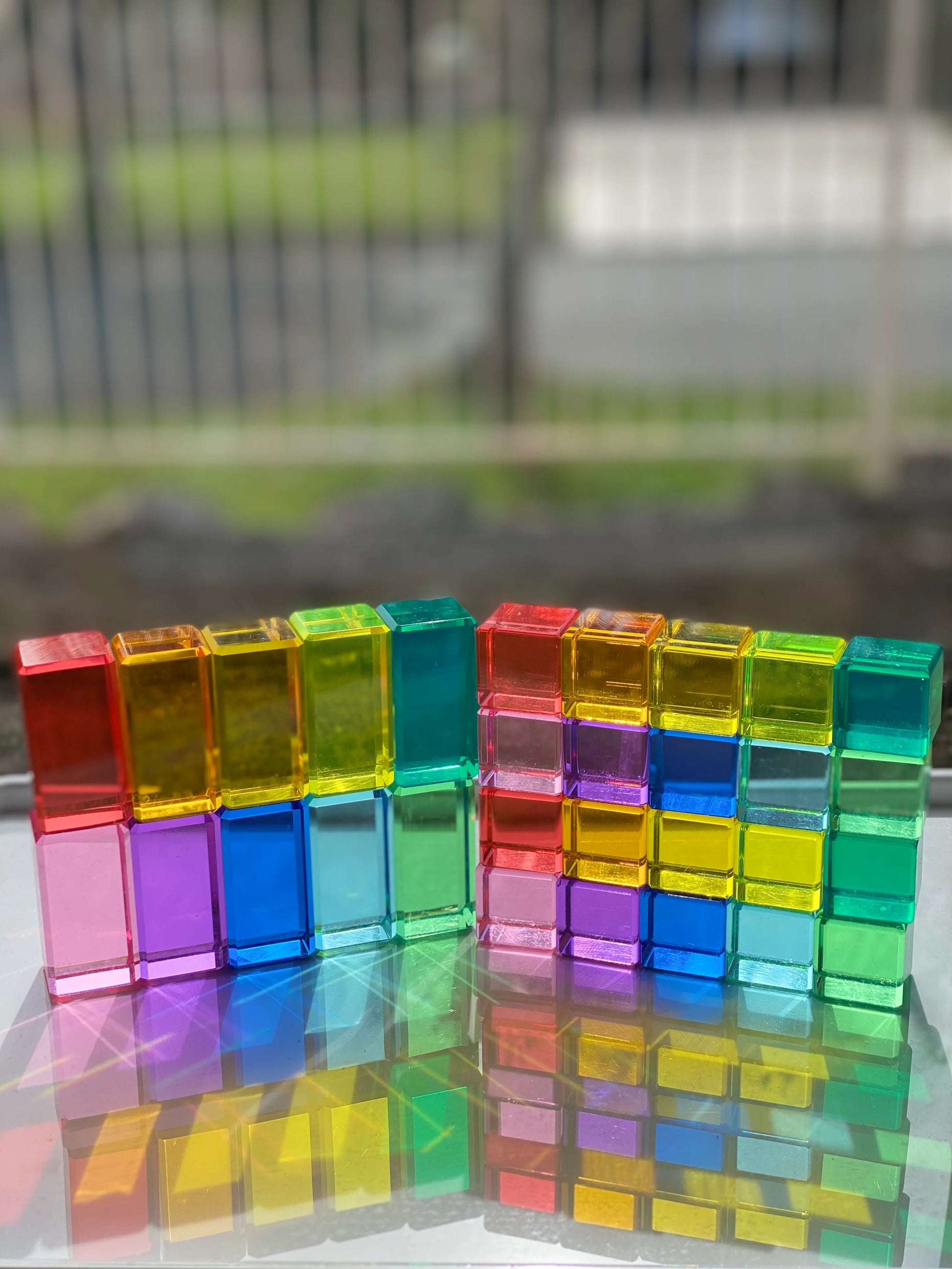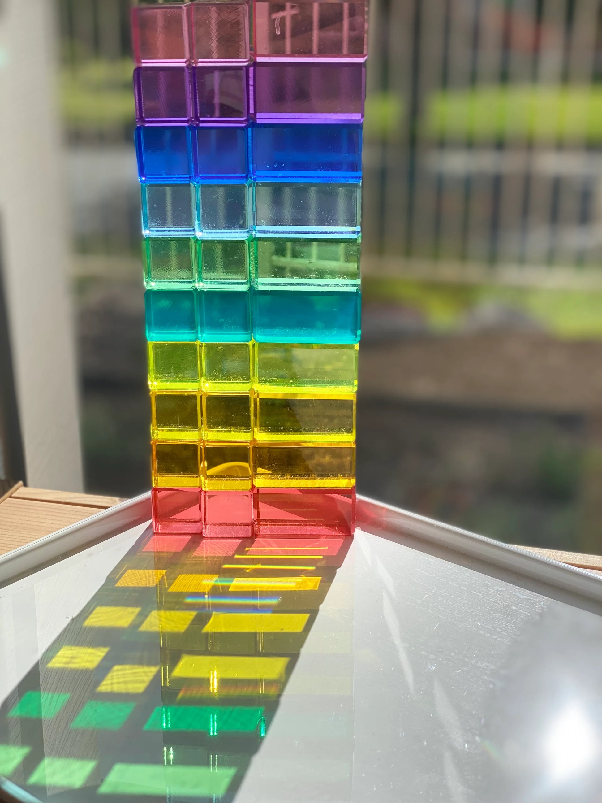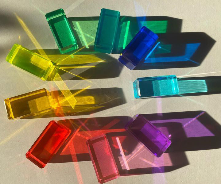 晶透明亮的積木在光線下呈現迷人的色彩,孩子探索與學習: