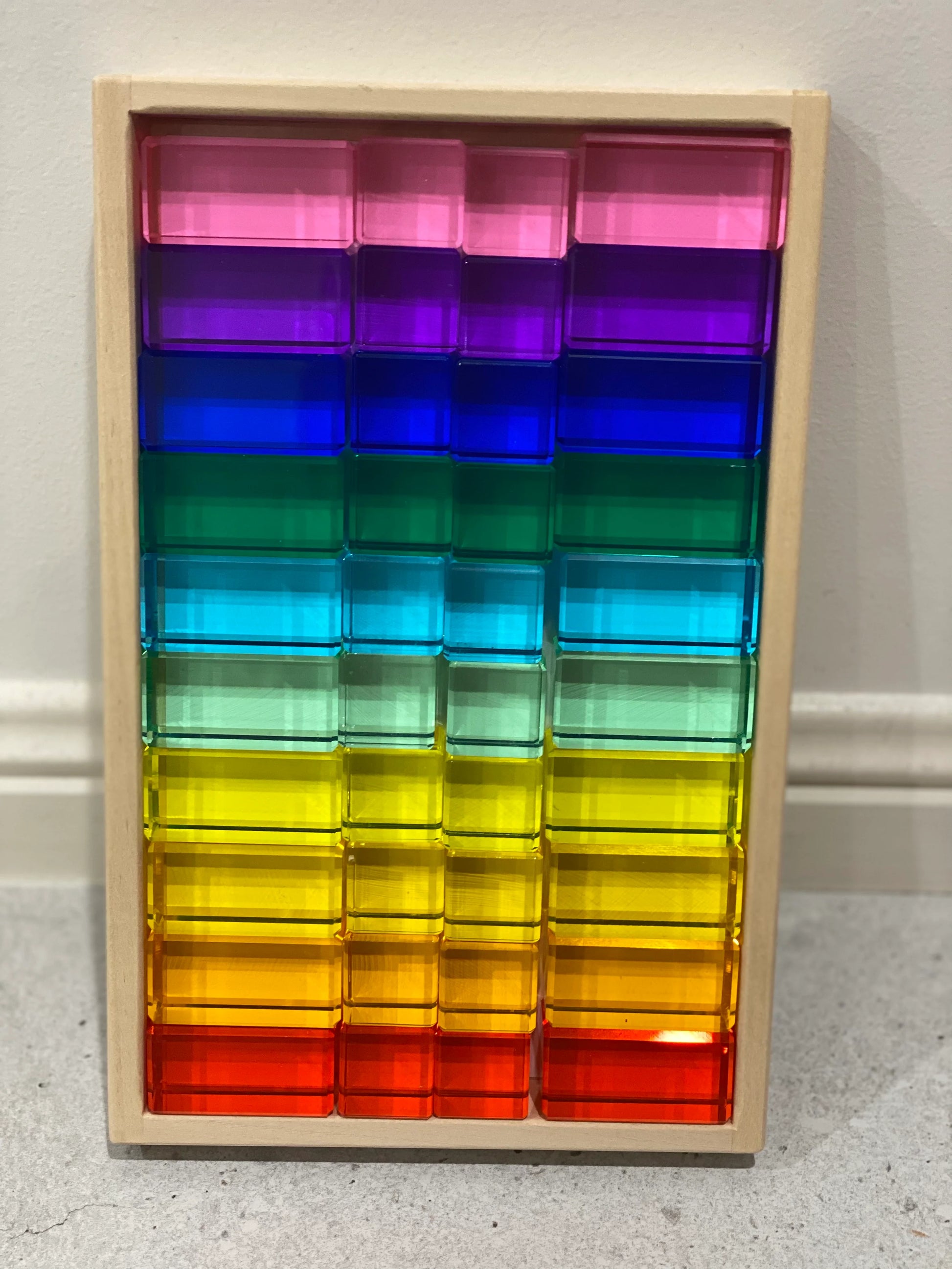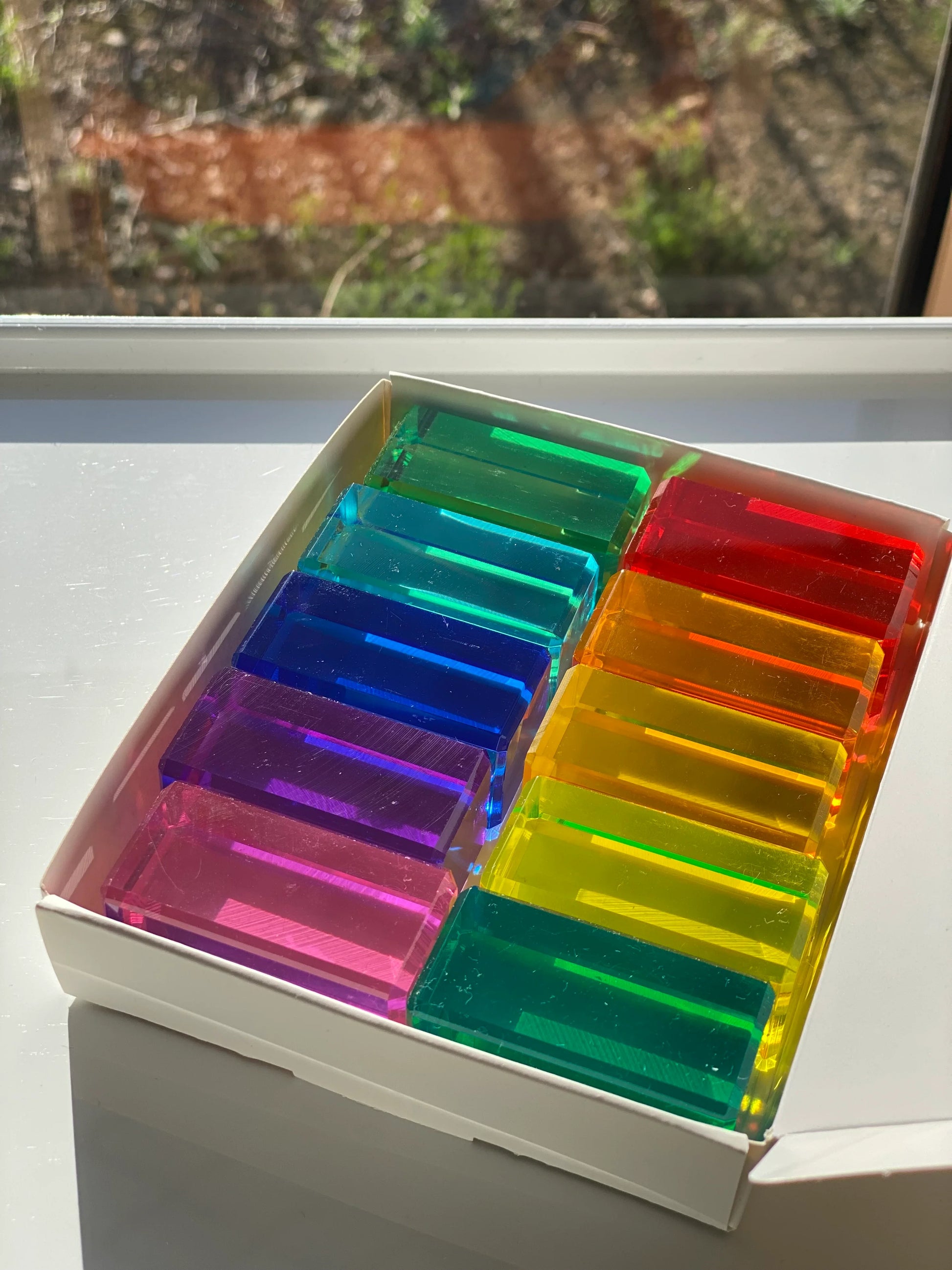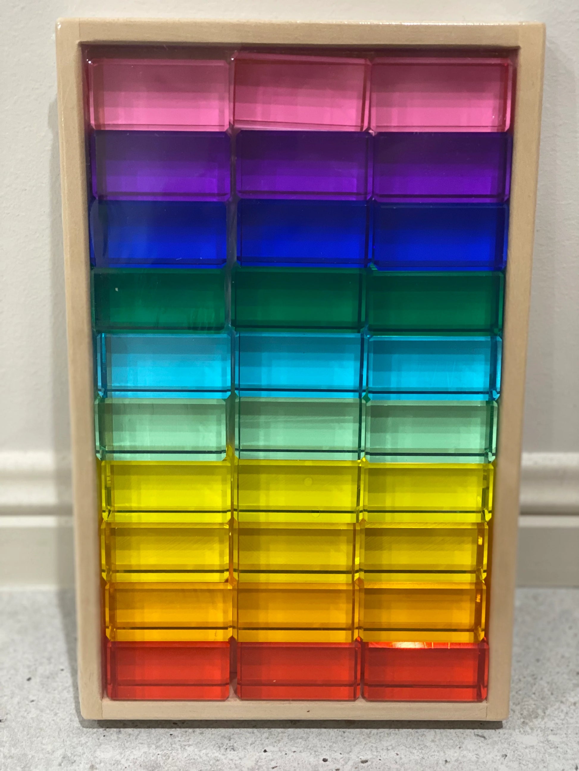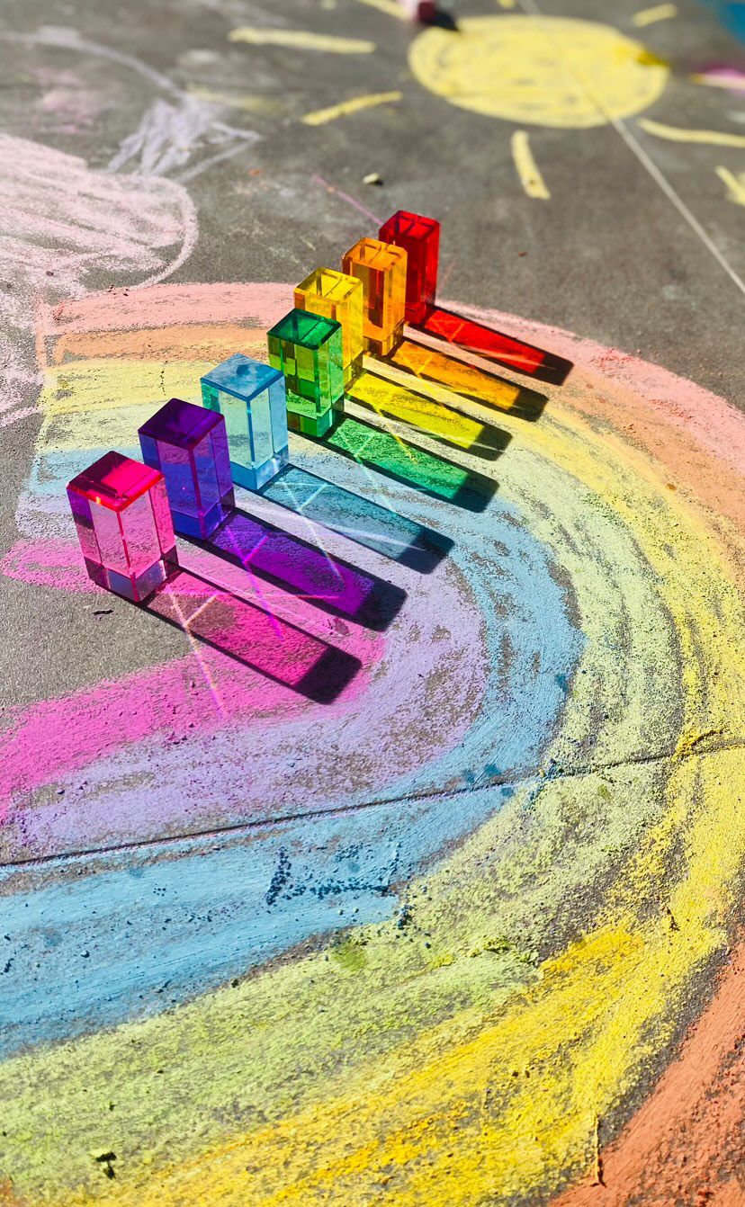 晶透明亮的積木在光線下呈現迷人的色彩,孩子探索與學習: