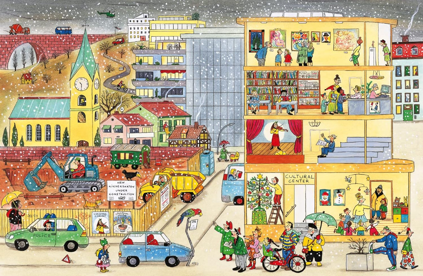 Winter has arrived and everywhere you look people are embracing the season. At home there's baking, reading, and sleeping in, while on the farm the fields are fallow and quiet. Outside people are bundled up against the cold as they are skating, sledding, and running to catch a crowded bus. The town's buildings are alive with activity--piano lessons, a dentist appointment, shopping for presents, and visiting the museum. And if you look closer, you'll recognize the same characters on page after page, each with their own story. Wilfred the jogger has lost his keys, and Erica is shopping for a Christmas tree. Each minutely detailed scene is bursting with different people, such as a cheerful lady with an umbrella and a young violinist, as well as animals and birds. In the tradition of Richard Scarry and Where's Waldo, this book encourages kids to return again and again to these charming spreads, following along with the characters and inventing their own stories. They'll recognize parts of their own world, while also learning about the endless ways we live, work, and play in the winter.