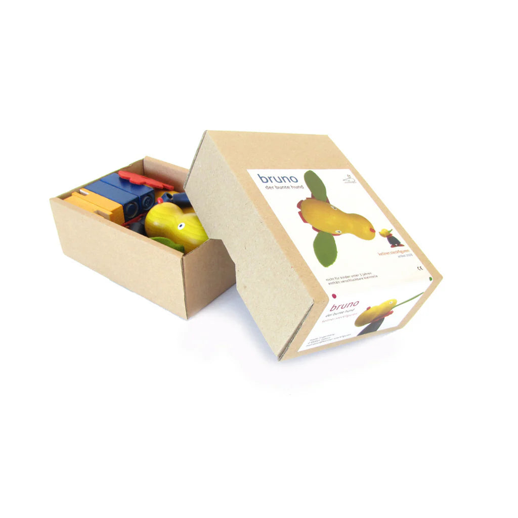 Bruno 是一隻可愛的小狗木玩具,擁有大大的耳朵,造型活潑、色彩鮮明。它由精緻、耐用的木質零件組成,可以簡單、安全地組裝,孩子可以依心情反覆拆裝,把 Bruno 打造成「奔跑、跳躍或舞動的小狗」,讓玩耍充滿變化與樂趣。